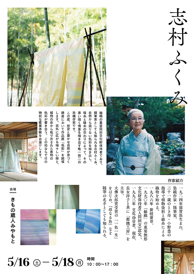 鎌倉・大町にある「きもの蔵人みやもと 」にて、重要無形文化財「紬織」の保持者(人間国宝)である染織家・志村ふくみ氏の作品展「色彩」が開催されます。