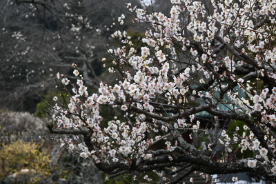 門前で、ウメの花を