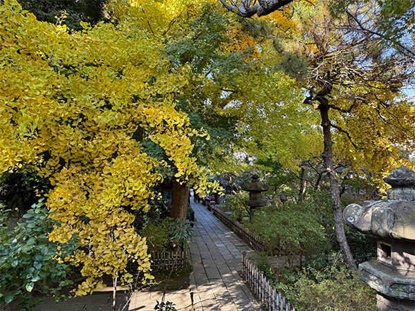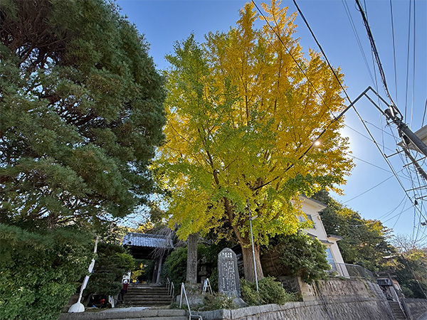 黄葉する安国論寺山門前のイチョウ