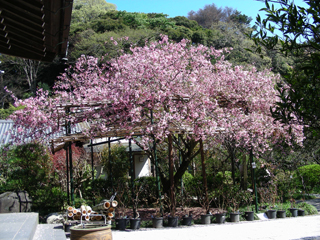 うつむき加減に花を咲かせるカイドウが、境内の雰囲気にぴったりです。