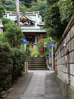 細い住宅街を抜ける参道