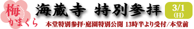 2026年3月1日(日)は、海蔵寺の特別参拝が開催されます。当日13時半〜14時半の間にいらしていただければ、海蔵寺本堂に特別拝観できます。定員はございません。本堂におまいりいただけるだけでなく、...(2026年2月27日付)