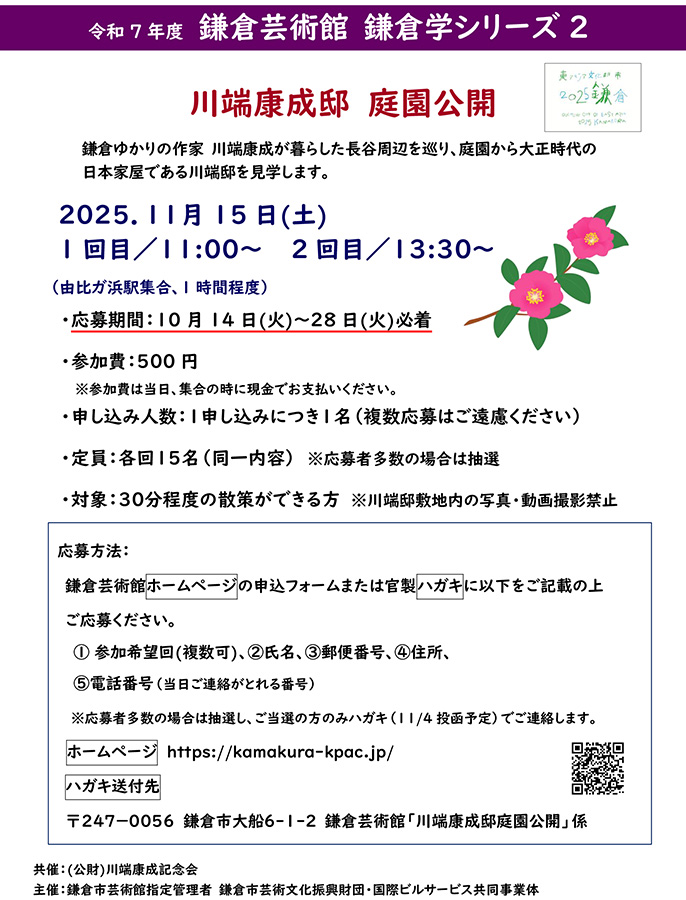 〒247-0056 鎌倉市大船6-1-2 鎌倉芸術館「川端邸庭園公開」係