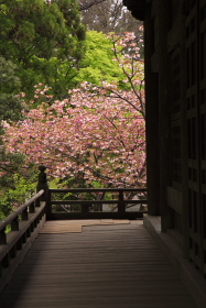 山門をくぐると見事な八重桜のピンクが目に飛び込みます。