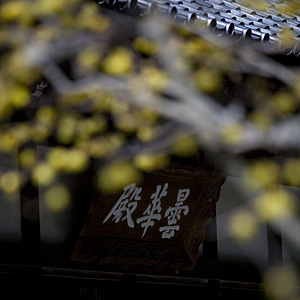 こちらは門の屋根をバックに、逆光に輝くロウバイ。
