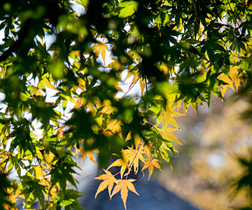 緑色とオレンジ色の混じるカエデの葉は、今の時期ならではです。
