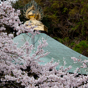 本堂の階段上から、擬宝珠と四天王像越しに満開の桜を。