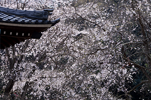 境内の満開の枝垂桜をバックに、僅かに咲く本堂横の紅梅。