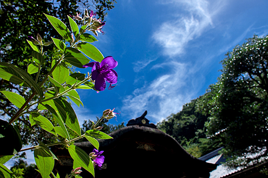 方丈門をバックに、紫紺野牡丹を。 空の雲は、秋の気配です。