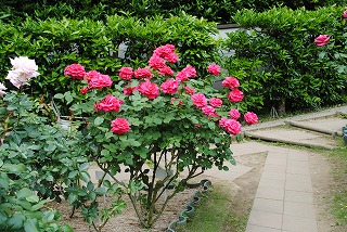 旧前田侯爵邸のクラシックな建物の前に、広い芝生があり、その前にバラ園がある。