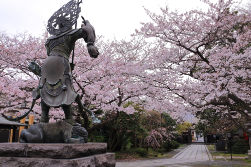 長勝寺は、名越坂の下にある、日蓮宗のお寺です。本堂前には見事な日蓮説法像があり、回りにを持国天、広目天、増長天、多聞天の四天王像が並んでいます。桜は満開、今が見頃です。