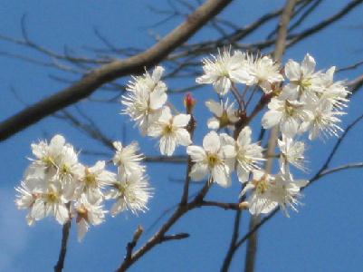 本堂横の池のほとりに梅の花に交じって白いシナミザクラ〔支那実桜〕と言う中国原産の桜が銀杏の木の隣で咲いて居ます。