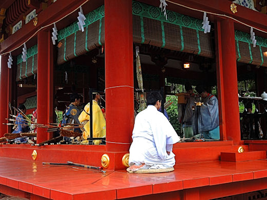 諸役・射手の皆さんは、舞殿で行われる「鎧陣之式(がいじんのしき)」に臨みます。