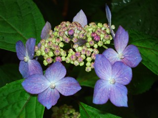 雨に打たれて色を増す紫陽花の花。
