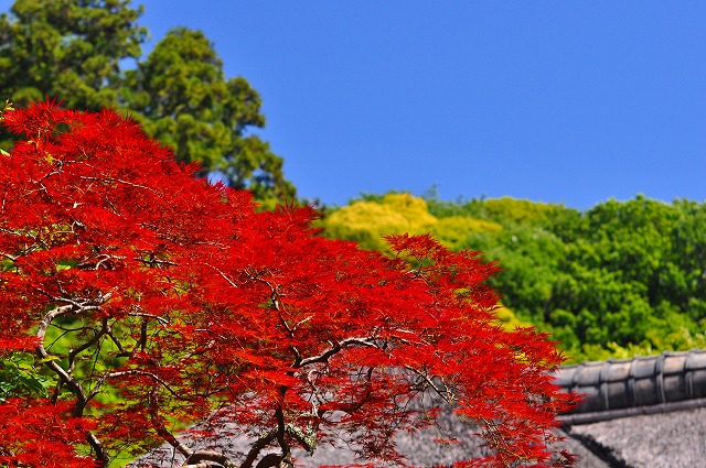 書院の裏庭に廻ると、真っ赤に色づいた手向山が青い空に映えます。