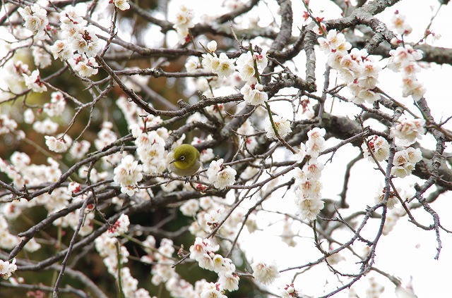 メジロも楽しそうに花をついばんでいます