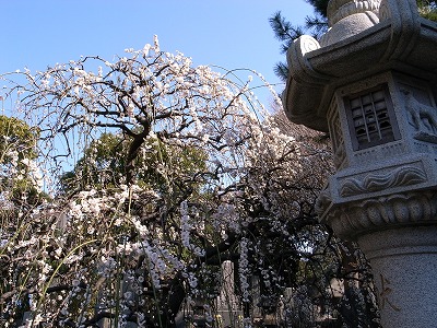 本堂前の左の枝垂れ梅はまだ満開です