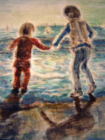 このぼんぼり絵は兄弟?が手をつないで海辺で遊んでいます。