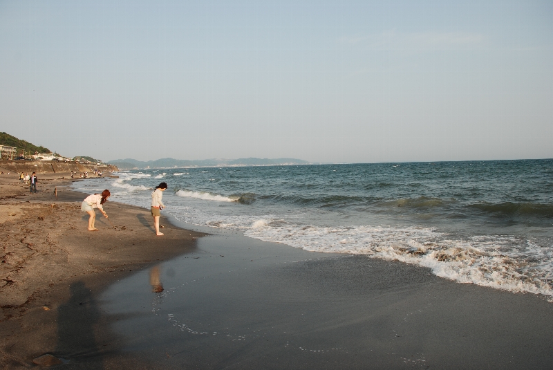稲村ヶ崎をかえりみると、波と戯れる女性、遠く小坪や葉山海岸が霞んでいます。夕刻の七里ヶ浜は静謐で、ただ波音だけが心地よく響いてきます。