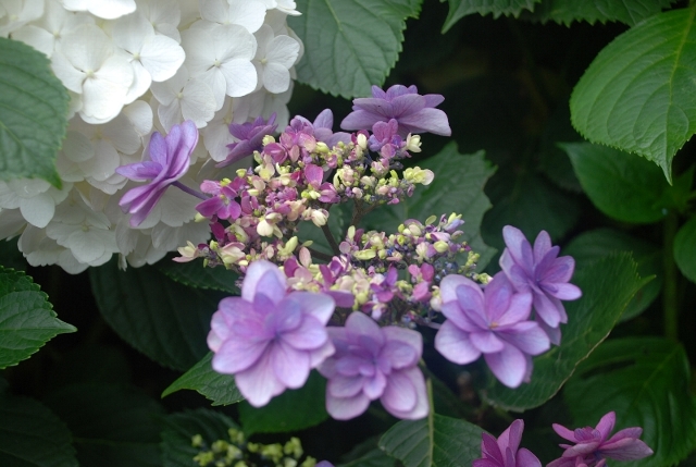 紫陽花も薔薇と同様種類が多いのです。色彩と形状に、沢山のバリエーションがあるので、見ていて飽きません。鬱陶しい梅雨を笑って過ごすには、紫陽花を見るしかありません。