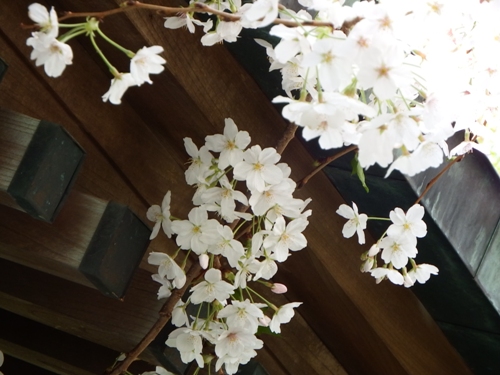 このお寺の桜は山門の屋根に平行するような形で枝が伸びており、なんともユニークな形が特徴。