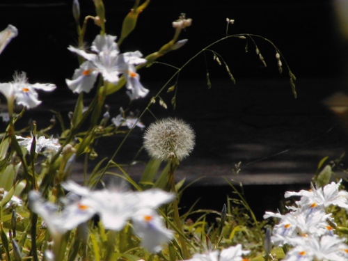 シャガの花が咲き乱れる中にタンポポの胞子がポツンポツンと。少し離れて見るとちょっと幻想的な感じ。