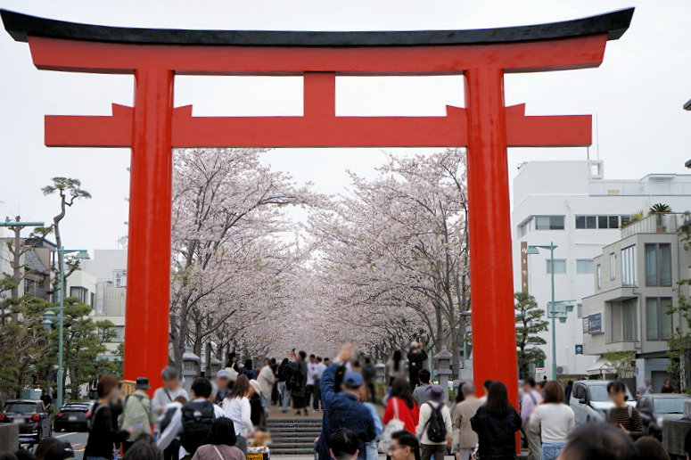 ◆”桜”越しに、三の鳥居から本宮を、鶴岡八幡宮