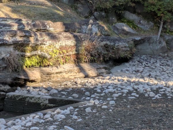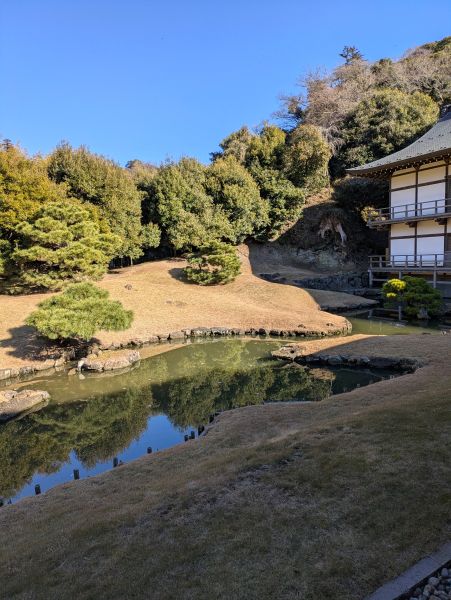 妙香池、水が抜けていますお寺の方に聞いたところここ何年か冬になると水が抜けてしまうそうです。山からの水も冬場は止まってしまうと、写真の奥に見える竹筒が水の出るところらしいです。次は建長寺へ向かいます