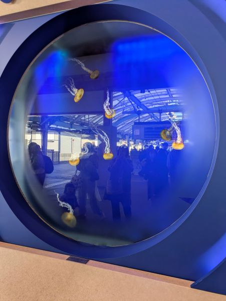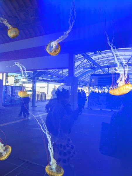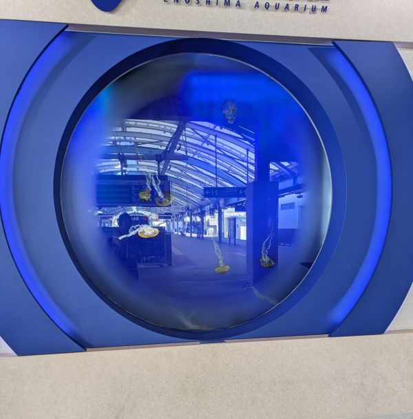 16日娘に誘われて江の島水族館へ…ところが・・・この日はJRが大幅に遅れ運休もあり(やんちょは小田急なので遅れず)娘が来ないず、やっと大船まで来たが湘南電車が来ない・・・先にイルキャンティで待っててと結局モノレールできた、楽しかったでしょう?と聞いたら子供たちはタブレットで動画を見てたと。そうなのね別名湘南ジェットコースターというのに・・・今日の片瀬江ノ島駅のクラゲ赤クラゲだわ
