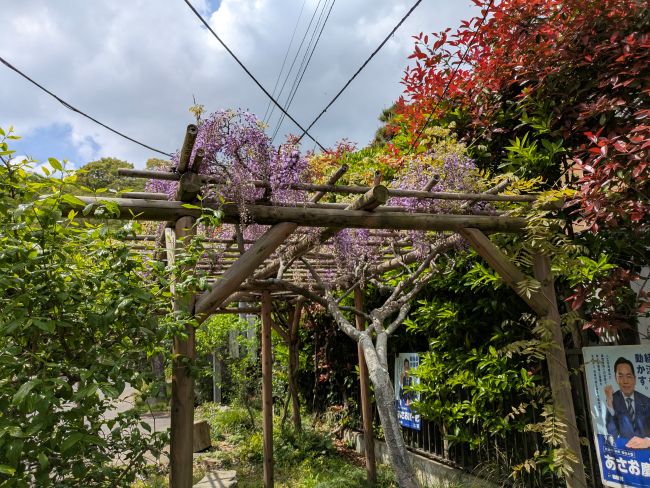 桜のほかにも藤棚があり、白い花と紫、まだ早いですかね